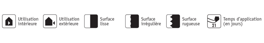 - Des pictogrammes pour fournir des indications sur la zone d’application (utilisation intérieure et/ou extérieure), la structure de la surface (lisse, irrégulière, rugueuse) et la durée maximale d’application (en jours).