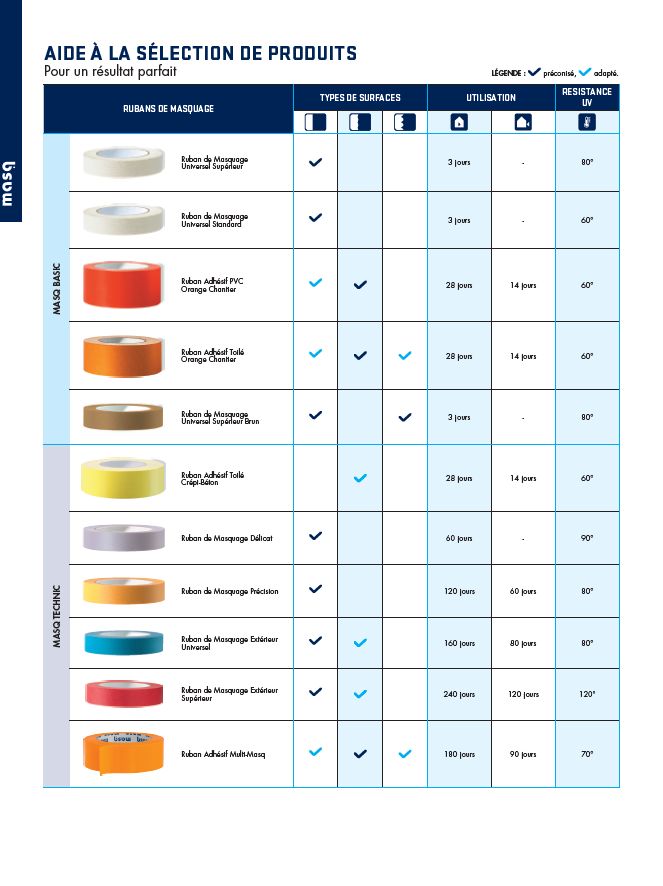 Utilisez notre tableau d’aide au choix pour sélectionner l’adhésif de masquage le plus adapté à vos travaux. Les produits de masquage et adhésifs MASQ ont été conçus dans un souci de répondre à toutes les contraintes des chantiers :